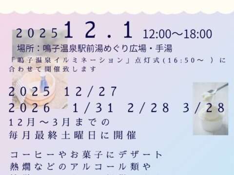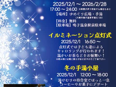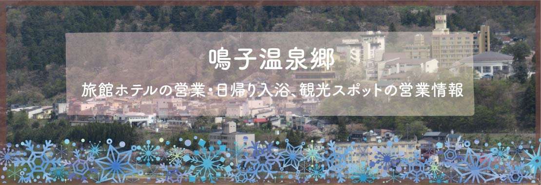 お知らせ クマ出没緊急事態宣言発令中 2025年11月2日 2025年11月30日まで イルミネーション点灯式 2025年11月18日 温泉総選挙2025結果発表 2025年11月6日 皆さまの応援投票ありがとうございました! 宿泊税のご案内 2025年11月2日 2026年1月13日から 鳴子温泉郷の紅葉情報 2025年10月15日 2025年の鳴子峡などの紅葉状況 鳴子峡案内図&バス時刻2025 2025年10月10日 バス運行:10月27日~11月9日 お知らせ一覧はこちら イベント情報 冬の手湯小屋 2025年11月18日 鳴子温泉イルミネーション 2025年11月18日 鬼首神楽保存会100周年記念公演 2025年11月9日 鳴子の米プロジェクト20年感謝祭 2025年11月7日 エキコン@鳴子温泉ステーションvol.9 2025年10月29日 ルネットライブ 2025年10月29日 イベント一覧はこちら 鳴子温泉の楽しみ方