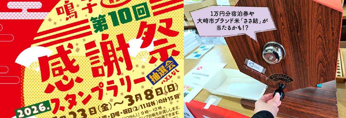 お知らせ 宿泊税のご案内 2025年11月2日 2026年1月13日から 風っこストーブ湯けむり号運行 2025年12月13日 12月20日・21日、1月24日・25日 イルミネーション点灯式 2025年11月18日 温泉総選挙2025結果発表 2025年11月6日 皆さまの応援投票ありがとうございました! クマ出没緊急事態宣言発令 2025年11月2日 2025年12月23日まで 鳴子温泉郷の紅葉情報 2025年10月15日 2025年の鳴子峡などの紅葉状況 お知らせ一覧はこちら イベント情報 第10回鳴子温泉感謝祭 2025年12月9日 鳴子温泉イルミネーション 2025年11月18日 お座敷温楽祭-温泉宿で音楽を楽しむ宴- 2025年12月8日 オニコウベスキー場 2025年12月7日 鳴子ホテル クリスマスイベント 2025年12月6日 鳴子温泉郷観光情報 2025年12月 2025年11月28日 イベント一覧はこちら 鳴子温泉の楽しみ方