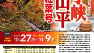 お知らせ 臨時バス「紅葉号」運行 【日程】2025年10月27日(月)~11月9日(日)期間中毎日運行【運行区間】鳴子温泉駅~鳴子峡鳴子口~日本こけし館~鳴子峡中山平口~しんとろの湯~中山平温泉駅【運行・お問い合わせ】ミヤコーバス古川営業所 TEL:0229-22-1781 2025.10.01 お知らせお知らせ2025