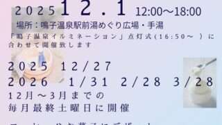 イベント情報 鳴子温泉イルミネーション 【期間】2025月12月1日(月)~2026年2月28日(土)【時間】17時~24時 ※点灯時間は多少前後する場合もあります。【場所】鳴子温泉駅前ゆめぐり広場・手湯 ※手湯の利用は20時まで【主催・問合せ】鳴子温泉観光協会 ℡0229-83-3441【共催】鳴子温泉旅館組合 2025.11.18 イベント情報イベント情報2025