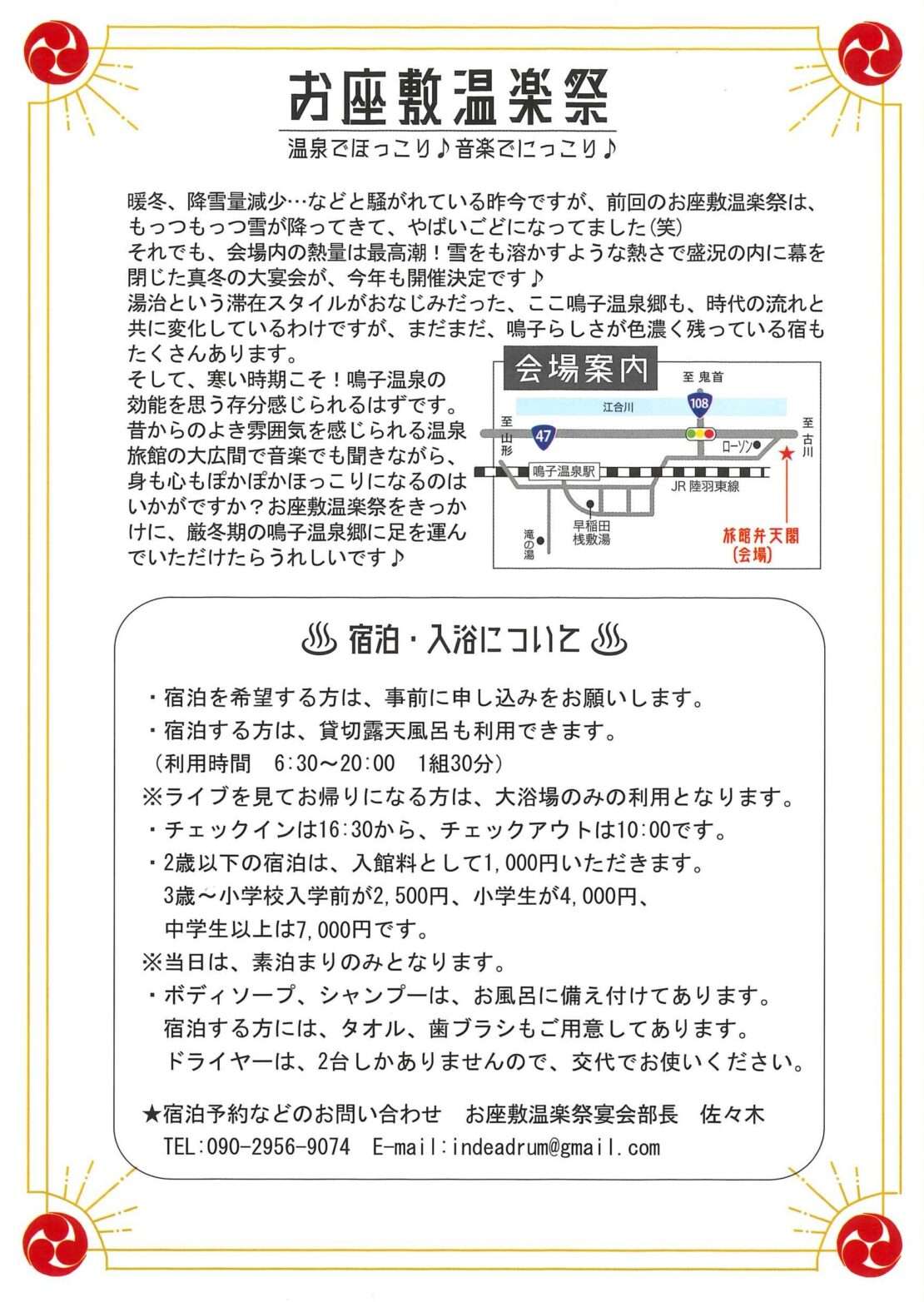 【問合せ】お座敷温楽祭宴会部長 佐々木 E-mail:indeadrum@gmail.com
