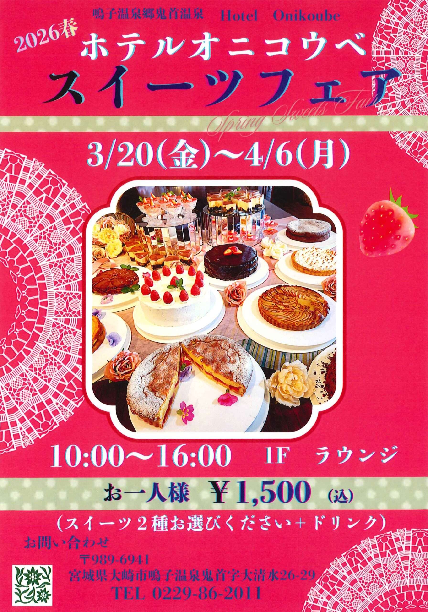 ホテルオニコウベ「スイーツフェア」 イベント情報 2026.03.18 鳴子温泉郷鬼首温泉にある「ホテルオニコウベ」1Fラウンジにてスイーツフェアが開催されます♬ぜひ皆さまお越しください! 【開催期間】2026年3月20日(金)~4月6日(月) 10:00~16:00【料金】お一人様1,500円(スイーツ2種+ドリンク)【お問合せ】ホテルオニコウベ TEL:0229-86-2011 宮城県大崎市鳴子温泉鬼首字大清水26-29