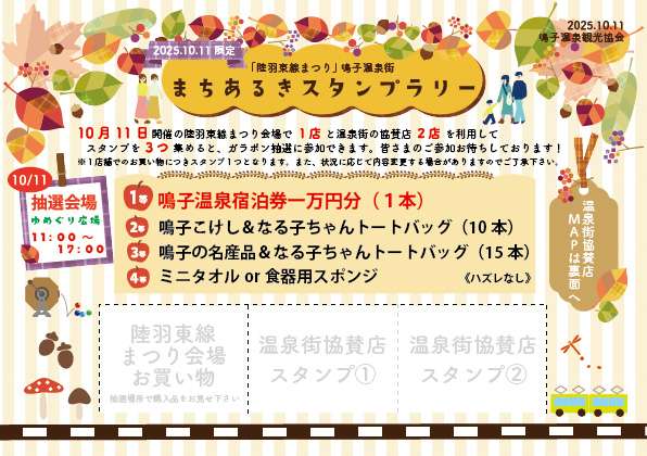 2025年10月11日(土)に開催される「4駅同日開催 陸羽東線まつり」にて、鳴子温泉街をお買い物で巡る「まちあるきスタンプラリー」が行われます。