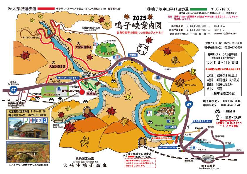 紅葉時期の営業時間:8時~17時 電話番号:0229-87-2050