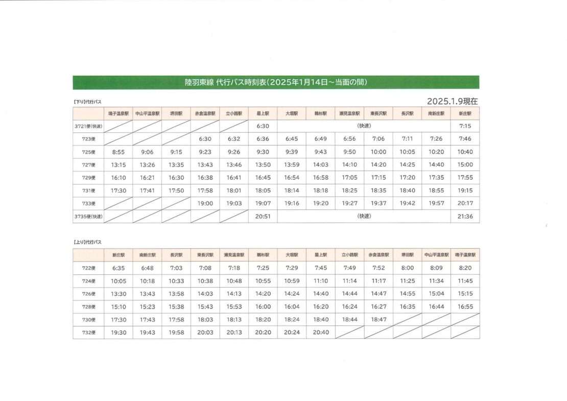 (鳴子温泉駅から新庄駅まで代行バスが運行しています※バスダイヤは下記へ)